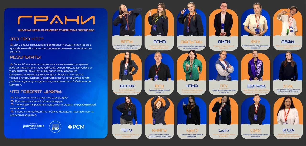 Участниками Школы стали 100 лидеров студенческого – самоуправления из 18 университетов Дальневосточного федерального округа. На Школе была реализована уникальная образовательная программа от команды Ассоциации тренеров РСМ по следующим направлениям: